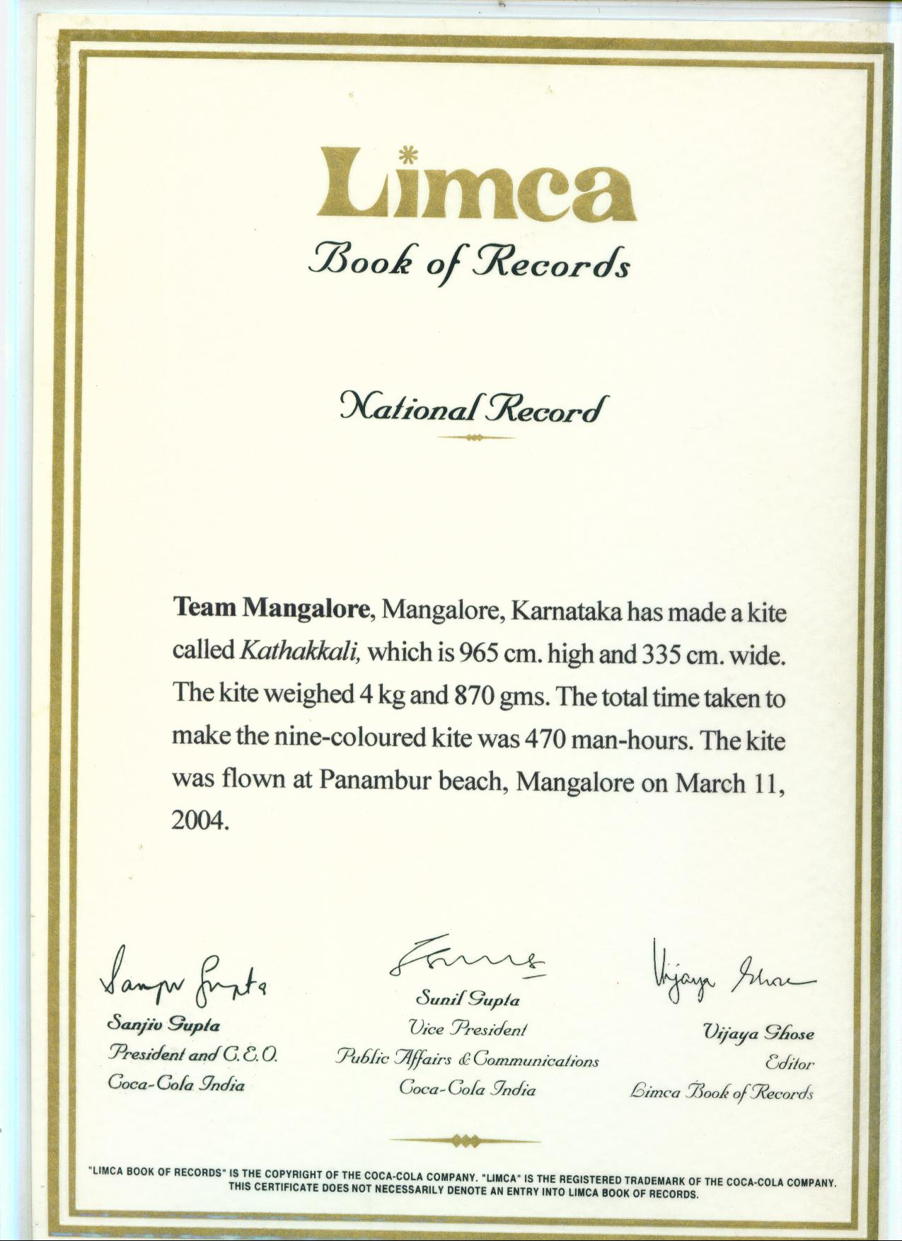 The kite "Kathakali" represents one such noble character. The Kathakali kite is made of 'rip-stop nylon' and bamboo (for spars) without using paint. The entire kite has been intricately stitched using appropriate colored cloth. It took 530 man hours to prepare this magnificent kite. The approximate cost for making this kite is Rs. 30,000/-.